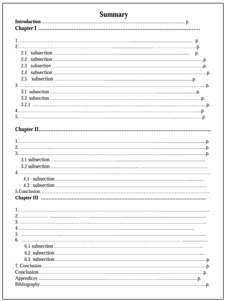 Main section titles (e.g., Tables, Introduction, Development, Conclusion, Appendices, Bibliography) are written in uppercase letters, while subsections are written in lowercase letters.